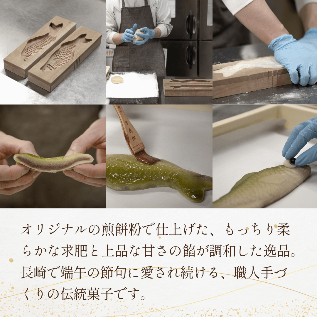 鯉のぼりをかたどった可愛らしい鯉餅菓子は長崎で端午の節句に愛され続けている伝統の祝い菓子です。