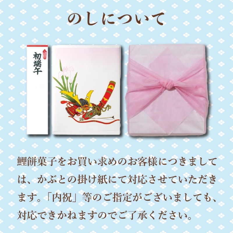 鯉餅菓子をお買い求めのお客様につきましては、かぶとの掛け紙にて対応させていただきます。「内祝」等のご指定がございましても、対応できかねますのでご了承ください。